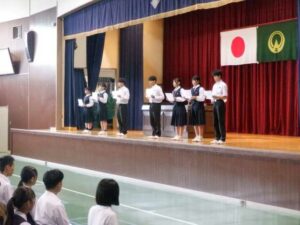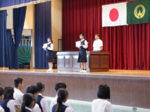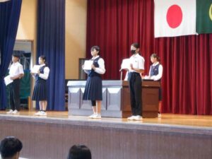 生徒会役員任命式 2025年10月2日 未分類 中間テストの後、後期生徒会役員の任命式を行いました。 生徒会長、副会長には校長先生から任命状が手渡されました。 生徒会執行部と 専門委員長となった生徒の皆さんには、生徒会長から委嘱状が手渡されました。 最後は、新生徒会長からのあいさつです。 「みんなで繋ごう上中リレー」のスローガンのもと、「たすき」を合い言葉に「た」のしい上中、「す」ごしやすい上中、「き」たくなる上中を目指しましょうと呼びかけました。 新生徒会長を中心に、よりよい上市中学校の校風を創り上げてもらいたいと思います。
