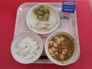 給食室より 10月2日(木)の献立 2025年10月2日 未分類 牛乳、ごはん、野菜シューマイ、こんにゃくサラダ、麻婆豆腐 今日は中華の献立です。麻婆豆腐は食材がみじん切りなので、調理員さん泣かせの献立でもあります。 「こんにゃくサラダ」は厚さ数ミリのうすいこんにゃくが入ったサラダで、ドレッシングによく絡み美味しいです。10月に入り、食べ物栄養クイズが新しく更新されました。今回のクイズは3週連続で「牛乳」がテーマです。クイズを通して皆さんに知ってほしい知識ばかりなので、ぜひ参加してみてくださいね。生徒玄関前に掲示してあります。