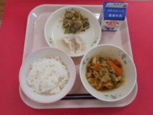 給食室より 10月6日(月)の献立 2025年10月6日 未分類 牛乳、ごはん、海鮮ぎょうざ、ビーンズナムル、回鍋肉 今日から1年生が宿泊学習に行きました。元気に活動をして楽しい思い出をたくさん作って帰ってきてほしいですね。今日の「回鍋肉」に上市産のたまねぎがたくさん使われています。
