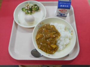給食室より 10月14日(火)の献立 2025年10月14日 未分類 牛乳、ごはん、秋の実りカレー、ゆでたまご、ビーンズサラダ 今日の給食のカレーには、上市町自慢の「里芋」が入っています。「里芋」のぬるぬる成分「ガラクタン」は、お腹の粘膜を守ってくれるためお腹の調子をよくしてくれます。その他上市産の「玉ねぎ」もたっぷり入っています。