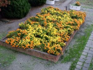 中庭のマリーゴールド 2025年10月14日 未分類 以前、こちらでも紹介したマリーゴールドです。何度かトラブルがあり、弱ってしまったときもありましたが、今は元気よくたくさん花を咲かせ、中庭はとても賑わっています。 こちらは、星をデザインした植え方になっている花壇です。星になっているのが分かりますか?