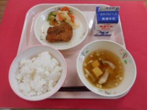 給食室より 10月21日(火)の献立 2025年10月21日 未分類 牛乳、ごはん、とんかつの甘辛煮、レモンあえ、きのこのお吸い物 今日は上市町農業者協議会からいただいた新米「コシヒカリ」が給食に出ました。今月3日にも提供され、今回は2回目になります。農家のみなさんに感謝の気持ちを込めて美味しいお米を味わってほしいです。そして今日は人気メニューの「とんかつの甘辛煮」が登場しました。美味しいお米とベストマッチな給食だったと思います。