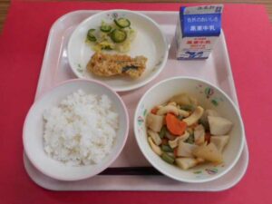 給食室より 10月23日(木)の献立 2025年10月23日 未分類 牛乳、ごはん、鮭のアーモンド揚げ、浅漬け、いかと大根の煮物 今日は「いかと大根の煮物」の中に上市産の美味しい里芋が入っていました。「いかと大根の煮物」は、毎年この時期に献立に入れています。