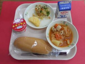 給食室より 10月24日(金)の献立 2025年10月24日 未分類 牛乳、コッペパン、オムレツ、切干大根のペペロンチーノ、チキントマトスープ、ヨーグルト 今日は合唱コンクール本番当日。生徒たちは一生懸命練習した成果を発表するために、朝から本番を前に素敵なハーモニーを響き渡らせていました。給食室からもみんなが練習の成果を発揮できるよう、給食を作りながら応援していました。