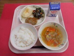 給食室より 10月29日(水)の献立 2025年10月30日 未分類 牛乳、ごはん、ハンバーグの香味ソースかけ、ひじきサラダ、野菜スープ、りんご 今日は上市町産のりんごが出ました。りんごは青りんごで品種は「王林」です。実り豊かな上市町のりんごを美味しくいただきました。明日は上市町産の柿が登場します。お楽しみに!