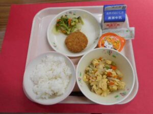 給食室より 10月31日(金)の献立 2025年10月31日 未分類 牛乳、ごはん、豆とかぼちゃのコロッケ、ブロッコリーのサラダ、卵とじ、ハロウインデザート 今日はハロウイン献立です。ハロウインは秋の収穫を祝い、いたずらをしに来る魔物たちを追い払うためにお化けなどの仮装をするお祭りです。給食では、ハロウインにちなんだかぼちゃのコロッケを食べました。