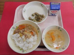 給食室より 11月4日(火)の献立 2025年11月4日 未分類 牛乳、ごはん、★豚肉と白菜のあんかけ丼、のり塩里芋、つるぎ育ちのきときと汁 今日は「かみいちの日」献立です。上市町の食材を使用した一品料理を昨年の冬に募集し、採用された献立が給食に登場しました。★印の豚肉と白菜のあんかけ丼が採用献立です。11月は採用された献立が7回登場します。お楽しみに!