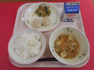 給食室より 11月12日(水)の献立 2025年11月12日 未分類 牛乳、ごはん、えびシューマイ、アーモンド和え、★マーボー里芋 昨日に引き続き「かみいちの日」献立です。3つ目の採用献立は、「★マーボー里芋」です。町産の里芋を使っています。調理のポイントとして、里芋は一口大に切って食べやすくするそうです。給食でもポイントをふまえて里芋をカットし、下茹でしてから最後に加えて仕上げました。今日も美味しく味わえましたか?
