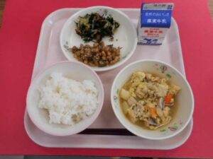 給食室より 11月20日(木)の献立 2025年11月20日 未分類 牛乳、ごはん、小魚と大豆のアーモンドがらめ、ひじき和え、白ねぎの卵とじ 今日は「小魚と大豆のアーモンドがらめ」が出ました。小魚も大豆もよくかんで食べる食材です。よくかんで食べると、①消化を助ける②血流がよくなり、脳の働きをよくする③虫歯を防ぐ④肥満を防ぐなどいいことだらけです。よくかんで食べることを日頃から心がけていきましょう。