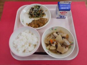 給食室より 11月27日(木)の献立 2025年11月28日 未分類 牛乳、ごはん、ぶりの香味ねぎソースがらめ、のり塩和え、いとこ煮 今日は「いとこ煮」です。「いとこ煮」は、報恩講(親鸞聖人の命日法要)や収穫祭の際に食べられることが多く、小豆、大根、豆腐、かぼちゃなどをしょうゆやみそで味付けした煮物で、富山県の郷土料理です。