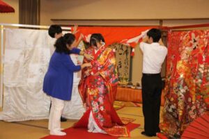 模擬結婚式の様子です。花嫁衣装の重さに驚きながらも「幸せの重さ」と言われていることに納得していました。