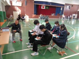 上市町内の約20の企業がブースを開き、中学生にいろいろな話をしてくださいました。生徒たちは興味津々で話に聞き入っていました。