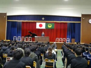 3学期始業式 2026年1月9日 未分類 新年おめでとうございます。本年もよろしくお願いいたします。 1月8日(木) 3学期の始業式を行いました。校長先生から、今年の干支である馬にちなみ「馬九行久」についてのお話がありました。上市中学校に関わる人々がみんなで力を合わせていけば、何事もきっと「うまくいく」! 始業式では、各学年の代表生徒が「新年の抱負」を発表しました。 新年を迎え、新たな気持ちで頑張ろうと決意していることと思います。それぞれの思いが実現するといいですね。