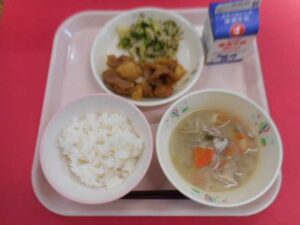 給食室より 2月19日(木)の献立 2026年2月20日 未分類 牛乳、ごはん、鶏肉と大豆ミートのアップルジンジャーソースがらめ、昆布サラダ、こんこん汁 今日の献立「鶏肉と大豆ミートのアップルジンジャーソースがらめ」は、令和4年の2月に1度実施された献立です。大豆ミートと聞くと、みなさんはどんなイメージがありますか。大豆だから栄養はあるけど美味しいのかな?とか、口の中に入れるとどんな食感なんだろう?と思う人もいるでしょう。でんぷんをまぶして揚げた大豆ミートは、もちもちした肉のような弾力のある食感です。今日は鶏肉とじゃがいもと一緒に大豆ミートをりんごと生姜のソースで絡めました。美味しくて食べやすい献立だったようで、残食がほとんどありませんでした。