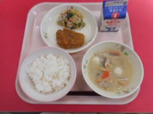 給食室より 2月24日(火)の献立 2026年2月24日 未分類 牛乳、ごはん、とんかつの甘辛煮、れんこんのアーモンド和え、合格だんご汁 今日は受験生応援!げんかつぎ献立です。「とんかつの甘辛煮」を食べて合格を必ず勝ち取ってほしいという願いが込めてられています。「れんこんのアーモンド和え」のれんこんは、将来の見通しがきくと言われ、またれんこんのように「ん」の付く言葉は運が良くなると言われています。給食室では調理員さんがいつも以上に腕をふるって作ってくださいました。みんなで一緒に給食を食べて受験生を応援しましょう!