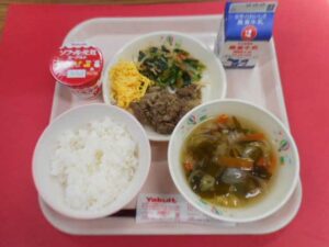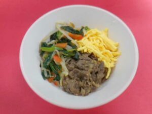 2026年3月2日 未分類 牛乳、ごはん、ビビンバ、わかめスープ、ヨーグルト 春を感じる3月に入りました。3月は3年生の県立入試と卒業式があります。給食は、「入試直前最強献立」を前日に食べて受験生を応援します。そして卒業をお祝いする「卒業お祝い献立」を食べてみんなでお祝いします。その他「ひなまつり献立」があります。 今日はごはんの上にビビンバの具をのせておいしくいただきました。