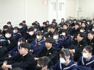各教室での終学活の後、学年集会を行いました。最後に校長先生から、卒業式に向けての心のもち方についてのお話と、県立一般入試を受験する生徒への激励のことばが送られました。