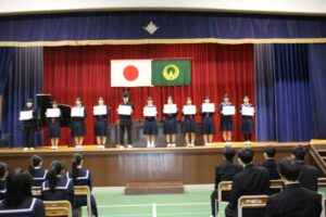 続いて、教育奨励賞の授賞式です。学業や学校生活、生徒会活動等で全校生徒の模範となる生徒を表彰しました。歴代上市中学校PTA会長で組織される「平成雅の会」会長様より賞状と盾が贈られました。