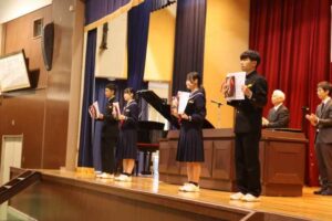 また、富山県中学校体育連盟表彰、富山県中学校文化連盟表彰、小さな親切・かくれた善行表彰等の受賞伝達を行いました。
