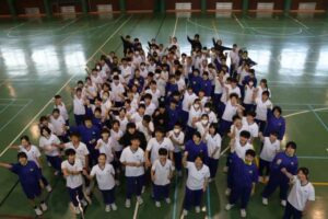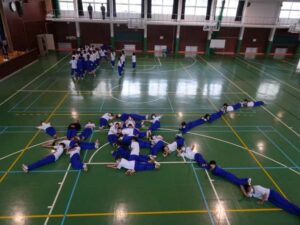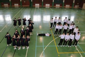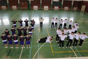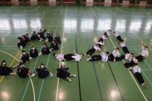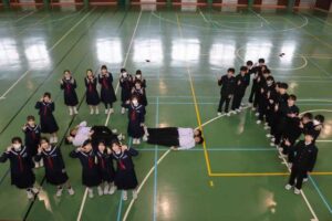 1年生の人文字づくりは、なかなか難しい文字にチャレンジしています。ご家族の方々、ぜひ何と書いてあるか解いてみてください。正解はお子様から聞いていただけたらと思います。
