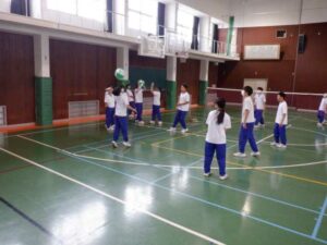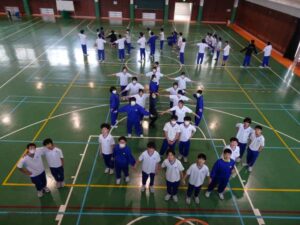 1年生は、ビーチボール大会、ジェスチャーゲーム、人文字づくりを行いました。