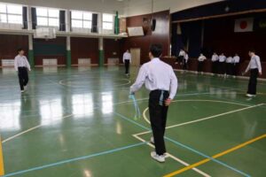 目隠しをして神経を研ぎ澄ませます。気配を感じたら、ソフトチャンバラで相手を斬ります。