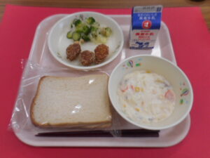 給食室より 4月17日(金)の献立 2026年4月17日 未分類 《4/17(金)の献立》 食パン、牛乳、おさかなナゲット、ビーンズサラダ、クリームシチュー 今日はパンの日です。上市の給食は月に1~2回の頻度でパンが出ます。学校給食のパンは、カルシウム強化のため脱脂粉乳が含まれています。給食では1日に必要なカルシウム量の2分の1以上はとれるように、食材や献立、調理方法などで工夫されています。