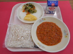 ソフト麵、牛乳、ミートソース、オムレツ、わかめサラダ