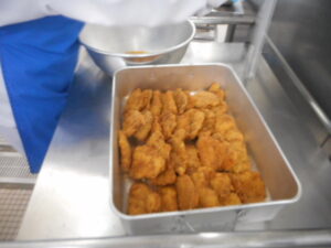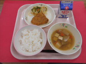 給食室より 4月27日(月)の献立 2026年4月27日 未分類 《4/27(月)の献立》 ごはん、牛乳、とんかつの甘辛煮、レモンびたし、けんちん汁 今日は「とんかつの甘辛煮」が給食に出ました。生徒や教職員みんなが大好きな献立なので、朝からテンションが上がります。給食室では入念なたれの味見のチェックもし、みんなで美味しくいただきました。