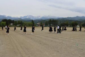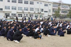 「給食室付近より出火、全員校庭に避難せよ」という放送が流れ、全校生徒が校庭に避難しました。