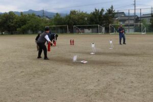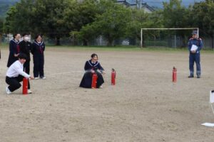 代表生徒が、実際に的にむかって消火器を噴射しました。上手に使えていました。