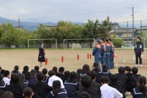 消防署の方より、生徒の皆さんは先生方の指示に従って、迅速に避難できていたという評価をいただきました。しかし、災害は突然おこるものなので、指示がなくても自分で判断して正しく避難することが大切だという話がありました。
